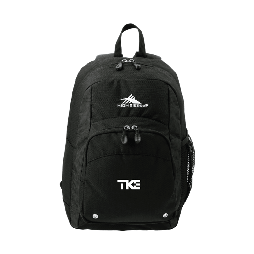 TKE Logo - 1C White. Constructed from a durable blend of poly and Duralite, the High Sierra Impact Backpack features a spacious front-loading main compartment. It also includes a large gusseted front pocket for additional accessories, a cell phone pocket, and a mesh water bottle pocket, plus a handy organizer with pen pockets and a key fob. The backpack has contoured, padded shoulder straps and a cushioned back panel for comfortable wear, along with a grab-handle for carrying. |
